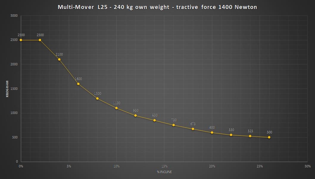 Ce modèle est disponible à partir de 300 kg, un poids suffisant pour assurer la traction et un freinage sûr. Il existe également une version allégée du Multi-Mover L25.
